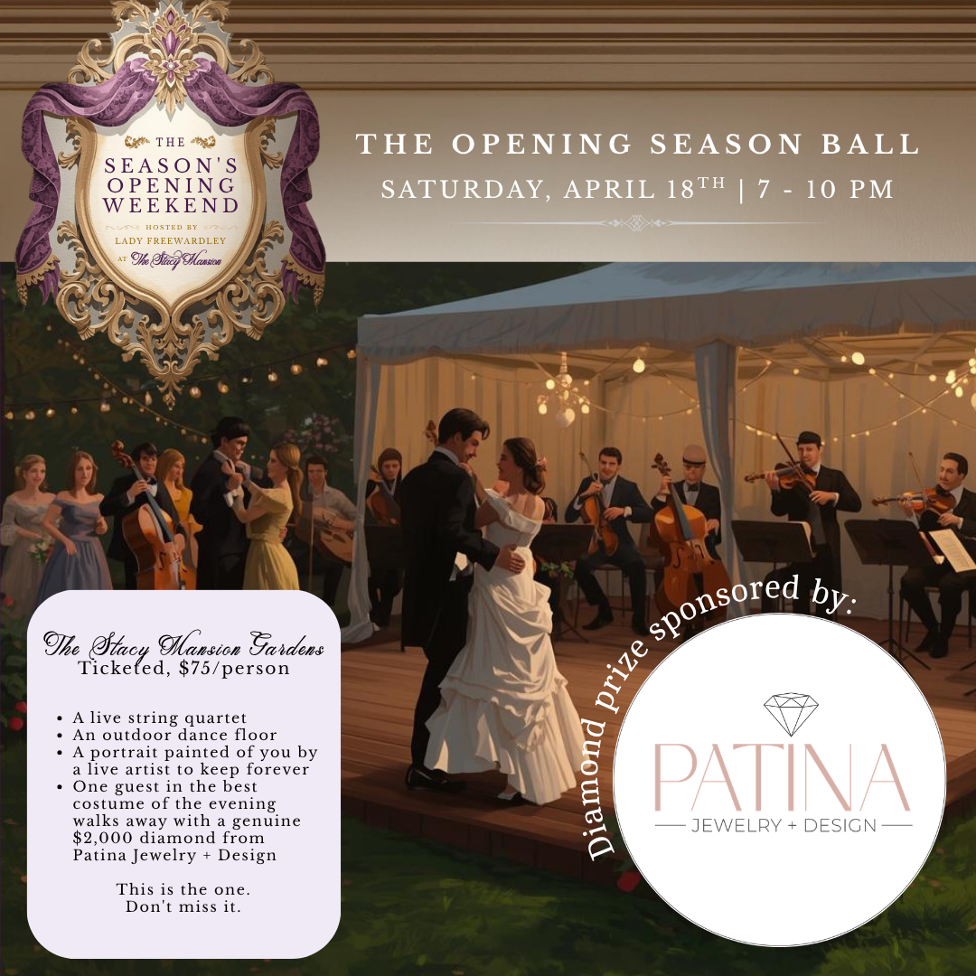 Join Lady Freewardley at The Stacy Mansion for a weekend of elegance, gossip, and grandeur. Three days of Regency-inspired celebration culminate in Lady Freewardley's Opening Season Ball — an enchanting evening of dancing beneath the open sky, live portrait painting, a visit from Her Majesty the Queen herself, and the chance to be crowned The Season's Diamond and walk away with a genuine 0.60 carat diamond valued at $2,000, sponsored by Patina Jewelry + Design.
