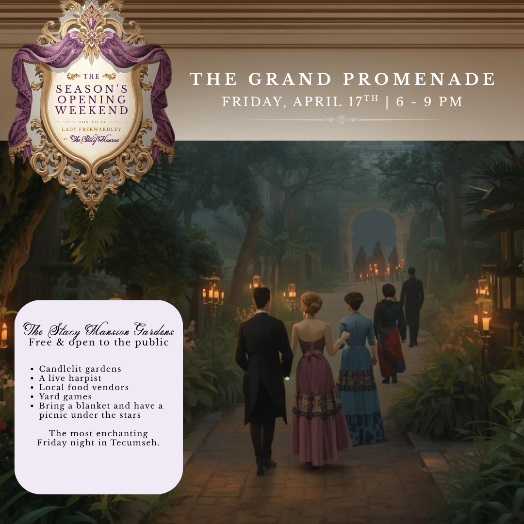 Join us at the Downtown Tecumseh Costume Contest on Saturday, April 18th at Adams Park. Registration opens at 1:00 PM and the contest runs 1:30–2:00 PM. A spot at Lady Freewardley's Afternoon Tea is the prize up for grabs — your costume could be your ticket in.